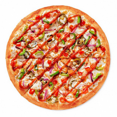 Состав: цыпленок, пепперони, сыр моцарелла, пицца-соус, грибы шампиньоны, перец халапеньо, сыр чеддер.